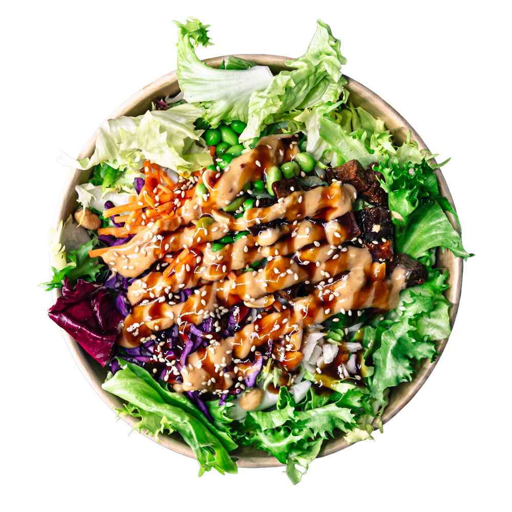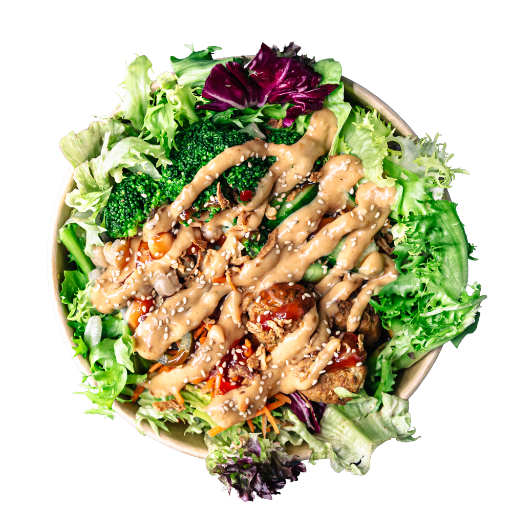 Alle Salate haben eine Basis aus frischem Salatmix mit unserem Essig-Öl-Dressing, 2 schmackige Saucen und mindestens 2 crunchy Toppings. Unsere Salate sind eine gute Low Carb Mahlzeit und deine beste Option, falls du keinen Bock auf Reis hast. Wenn dir eine Zutat nicht passt, dann sag uns Bescheid und wir tauschen sie gerne gegen eine gleichwertige deiner Wahl aus.